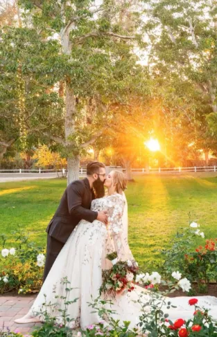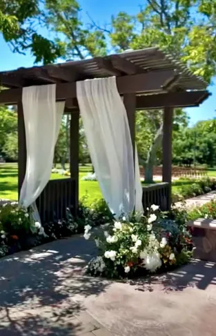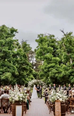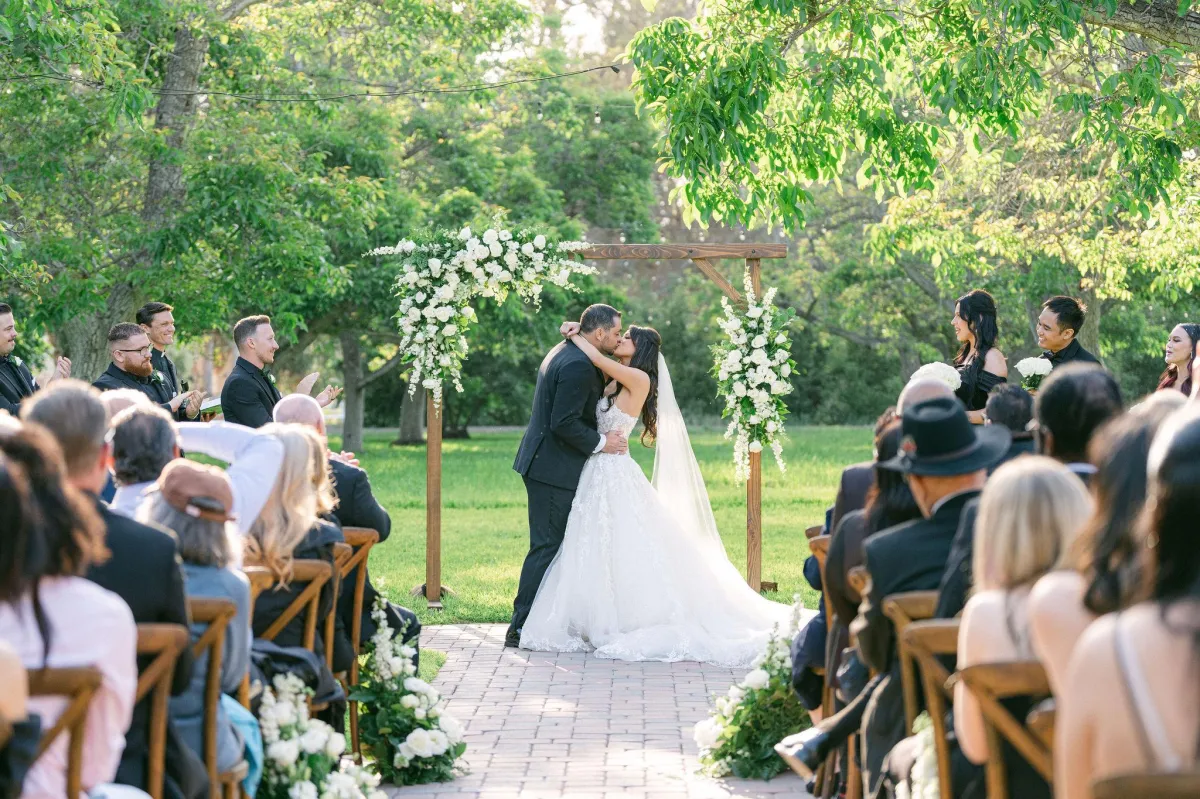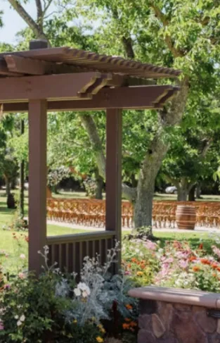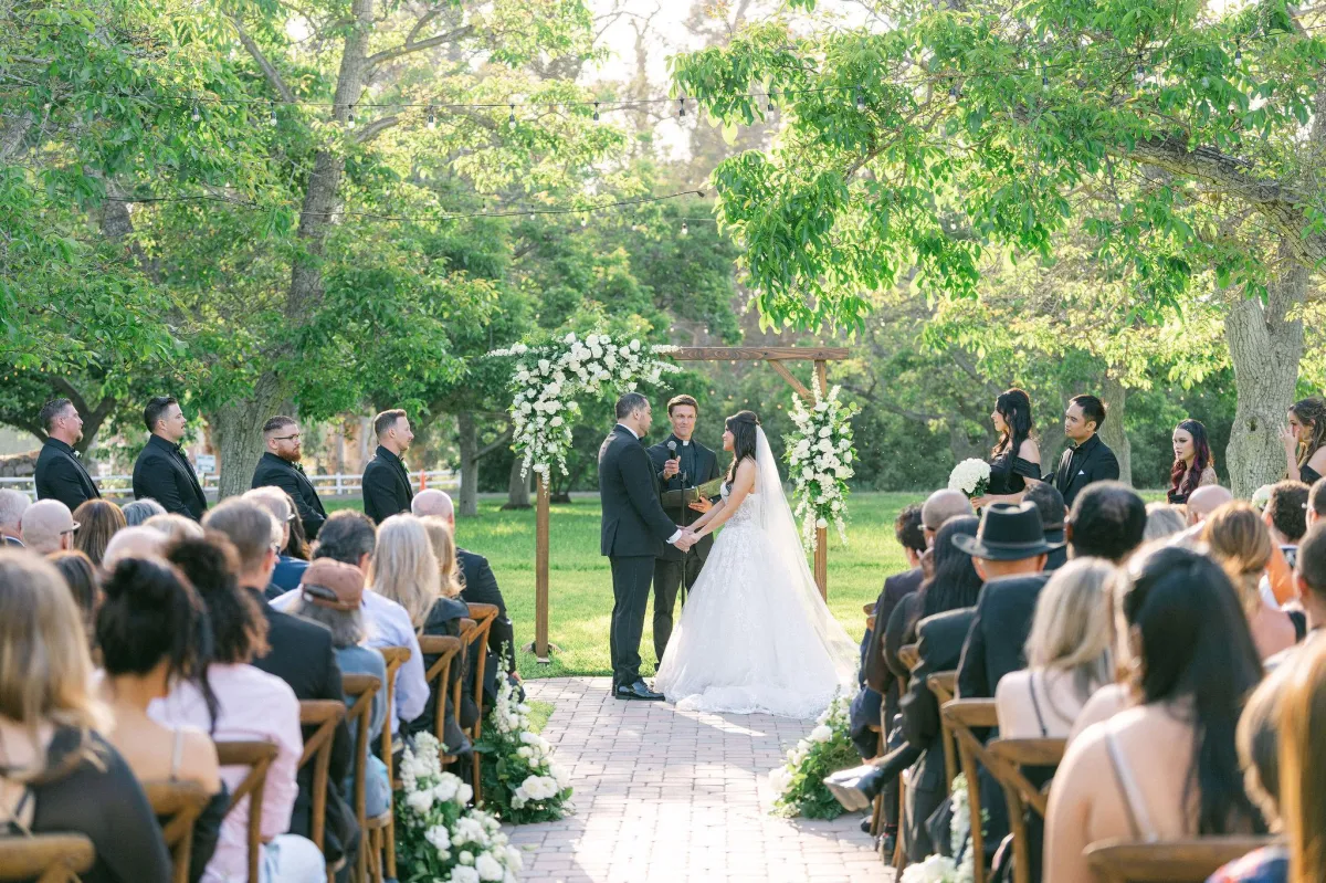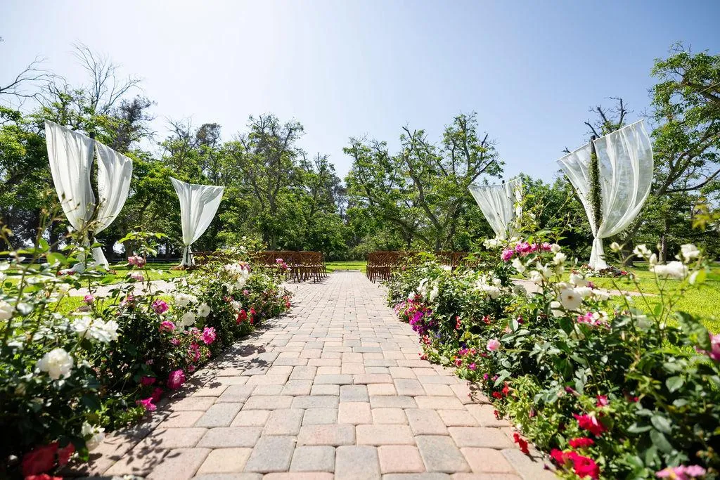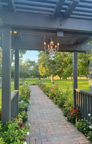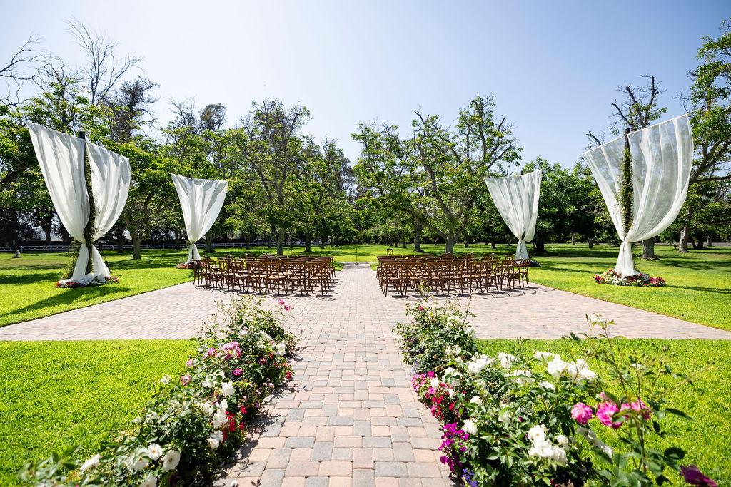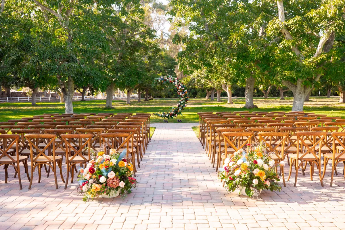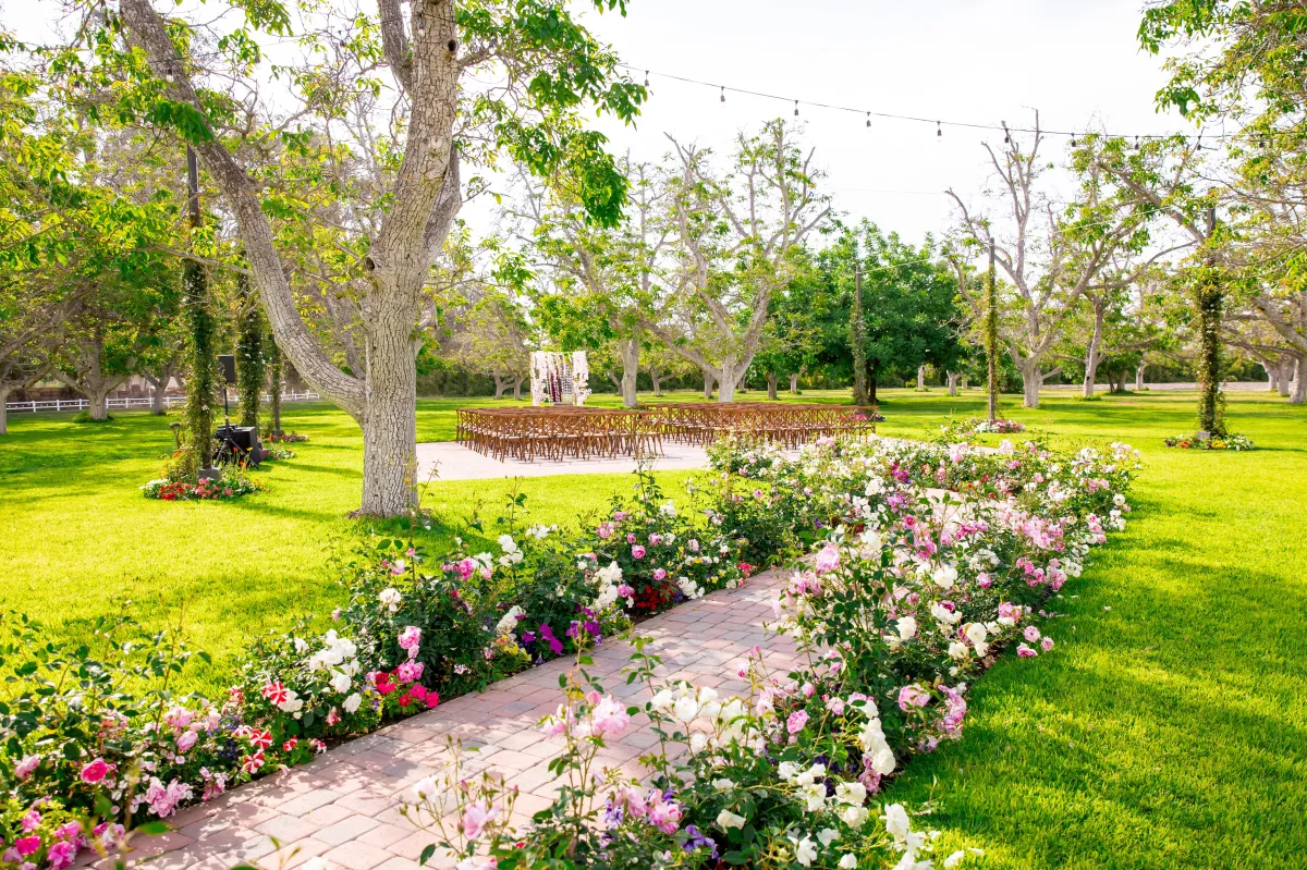 The ceremony area is situated in a 3-acre field of mature walnut trees that provide natural shade and a beautiful setting for the wedding ceremony. A 40'x40' area is designated for the placement of chairs and other ceremony seating, and it features pavers that match the rest of the site. The area is surrounded by six poles that can be used to customize the look and feel of the ceremony with chandeliers, fabric, and lights. The DJ sets up adjacent to the ceremony area, providing optimal sound quality for the ceremony.