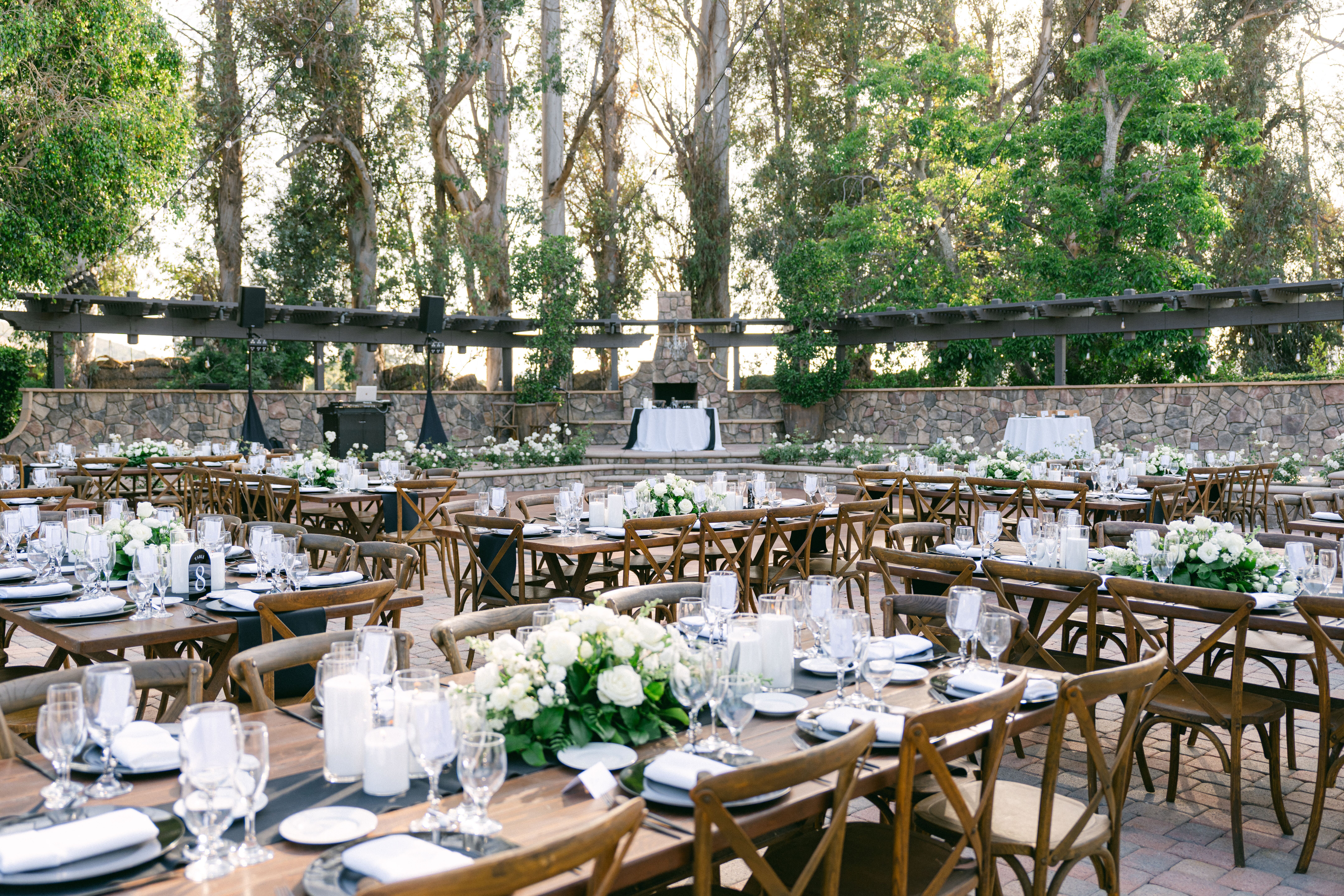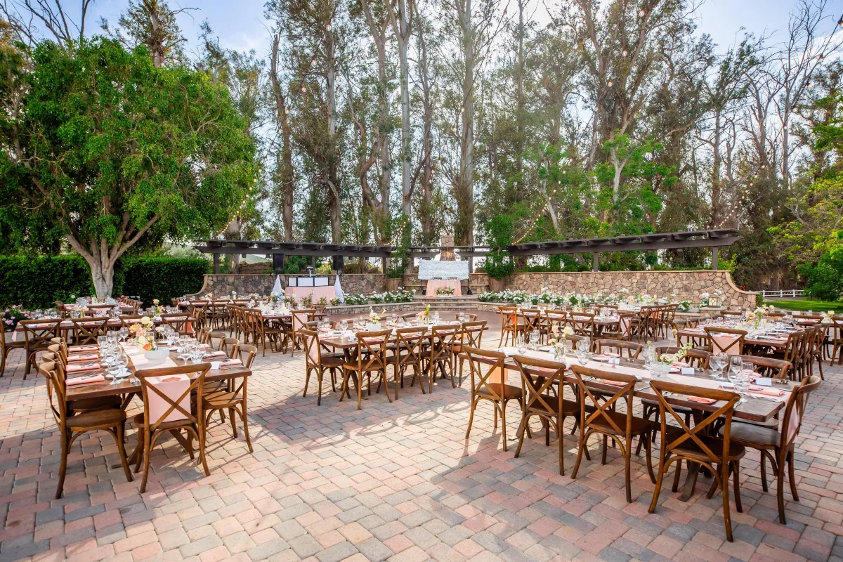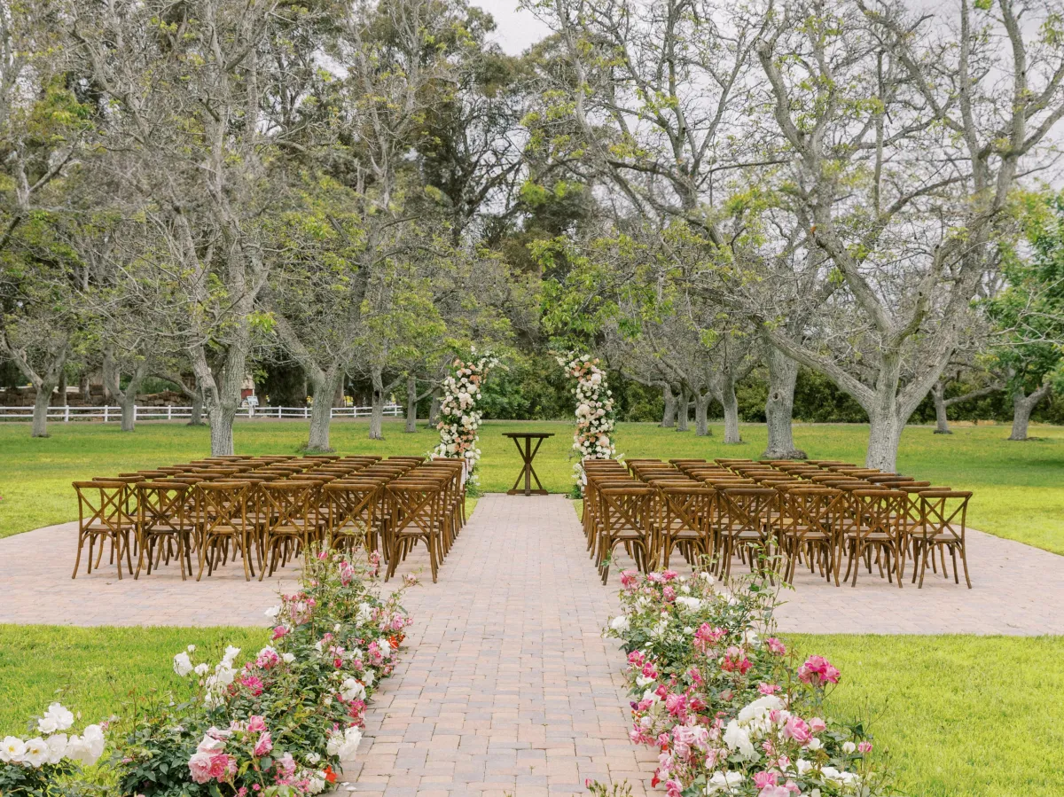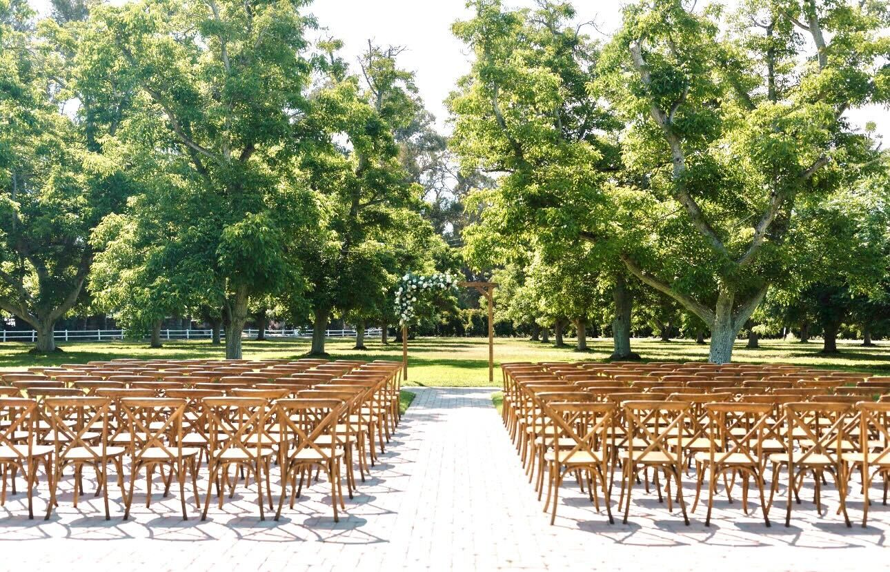 The ceremony area is situated in a 3-acre field of mature walnut trees that provide natural shade and a beautiful setting for the wedding ceremony. A 40'x40' area is designated for the placement of chairs and other ceremony seating, and it features pavers that match the rest of the site. The area is surrounded by six poles that can be used to customize the look and feel of the ceremony with chandeliers, fabric, and lights. The DJ sets up adjacent to the ceremony area, providing optimal sound quality for the ceremony.